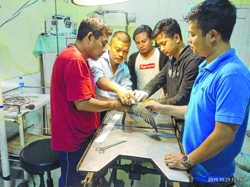 Staff of State Veterinary Hospital, took time off of the Ningol Chakkouba festival and came to the hospital to tend to the migratory bird. An XRay showed that the bird had a broken left wing and Superintendent Dr Priyokumar and surgeon Dr Open are closely monitoring the bird currently.