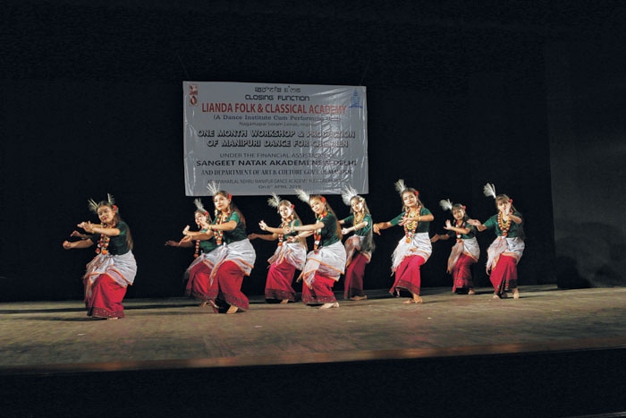 It’s interesting to mention a brief sketch of Lianda Folk & Classical Academy. The Lianda Folk & Classical Academy was established in the year 2nd February, 2001 under the dynamic leadership of Smt. A. Raseswori Devi with reverent aspiration and hopes for preservation and development of classical and tradition folk art of Manipur. The institution aim at to give training and imparting knowledge of folk and classical art and philosophy in various forms to the young enthusiastic youths of all the works of the living exponents on Manipuri folk dance and to research on the arts philosophy.