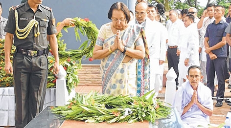 Floral tributes were also paid at the complex of Thangal General Temple, Palace Compound, led by the Chief Minister along with his Cabinet Ministers, MLAs, top police and civil officials and the people. In the afternoon, Governor Dr Najma Heptulla along with Chief Minister N Biren and his Cabinet Ministers laid wreaths to the martyrs at Kangla Uttra as part of the observation.