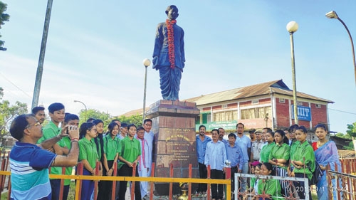 Bishnupur: Meanwhile, a simple function was held at Shanti Bazaar, Leimaram in Oinam AC to pay floral tributes to the statue of Lamyanba Hijam Irabot to celebrate his birth anniversary month and to mark the beginning of the 'Irabot Memorial Month' today.