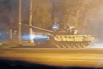 A Ukrainian armoured column headed along the road, with soldiers seated atop turrets smiling and flashing victory signs to passing cars which honked their horns in support.