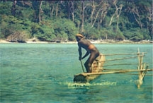 Lifestyle – The Sentinelese have similarities and dissimilarities in their habits and tools with the other Andamanese groups. Their homes are very simple; temporary huts are erected on four poles with slanting roofs paved with leaf/palm fronds. Community huts and fireplaces have also been noticed. The Sentinelese are hunter-gatherers; they hunt terrestrial wildlife which is mainly pig and do fishing, but no farming. Honey, wild pig, coconut, fruits, fish, turtle, eggs are their staple food items. The boats they use for lagoon-fishing are narrow outrigger canoes propelled with long poles. They do not venture deep into the sea. They make and use cane & bamboo baskets, wooden items, fishing nets, etc. They do know the value of metal that is scavenged from vessels having met with accidents; though they create tools and weapons they do not have knowledge of metallurgy except cold foraging to make arrow heads, etc. Simple geometric designs and shade contrasts have been seen on their weapons. Both male and female wear bark strings, some ornaments (necklaces) and headbands; the men have a waist belt into which the dagger is tucked. Bow & arrow is their main weapon. They do indulge in dancing and music by beating their thighs with hands.